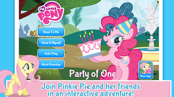 My Little Pony: Party of One är en utbildningsapp som erbjuder en interaktiv berättelse med Pinkie Pie och hennes vänner. Spelare får följa med på ett äventyr där de hjälper Pinkie Pie att bjuda in sina vänner till en fest, samtidigt som de utforskar olika scener och löser mysterier. Appen är designad för att vara både underhållande och pedagogisk, med fokus på att utveckla läsfärdigheter och ordförråd hos barn. Med färgglad grafik och animationer gör den varje sida till en engagerande upplevelse för unga användare.